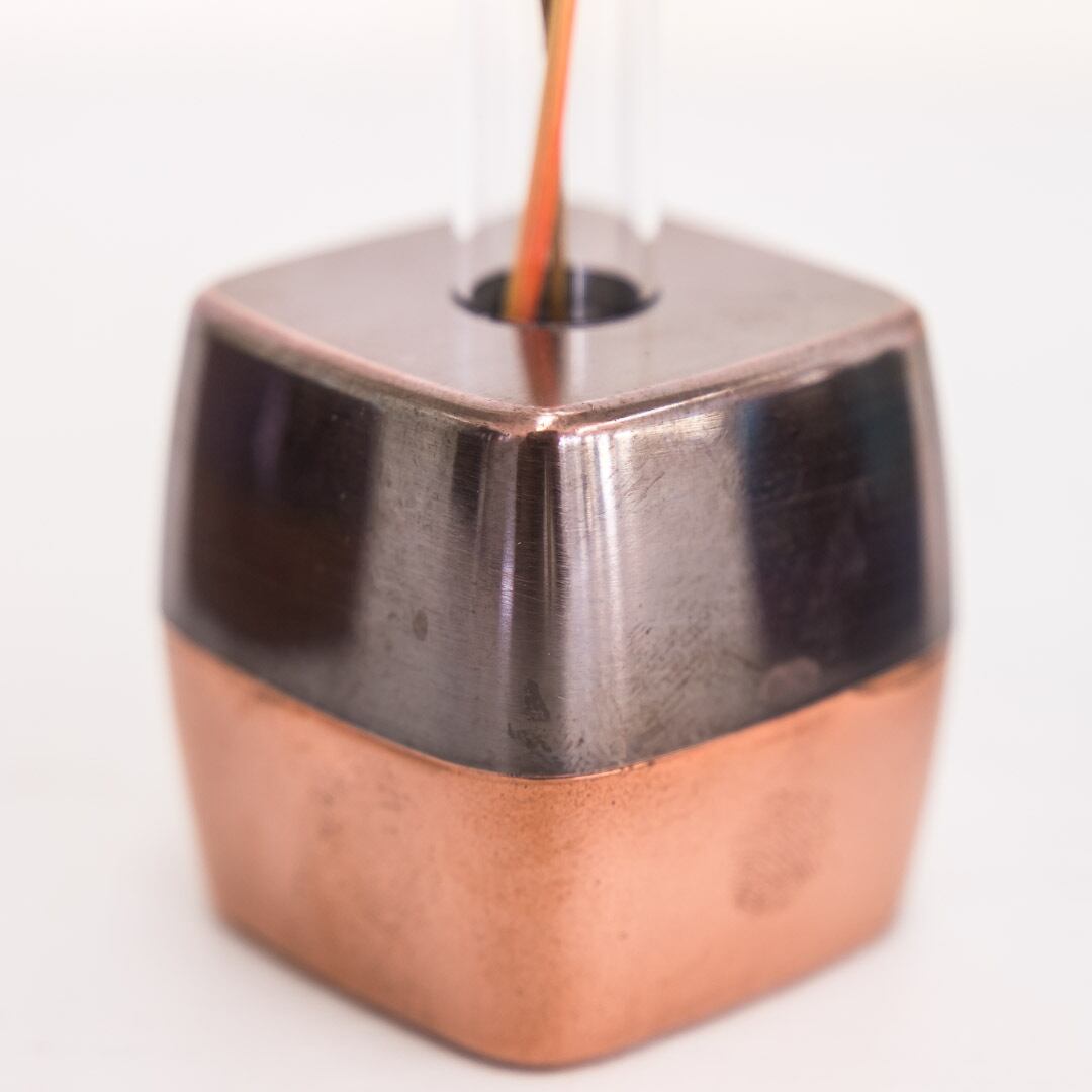 プラスチック成形品によるモダンで丸みを帯びたキューブ型の形状に、めっき処理によって情緒的な金属質感を与えました。