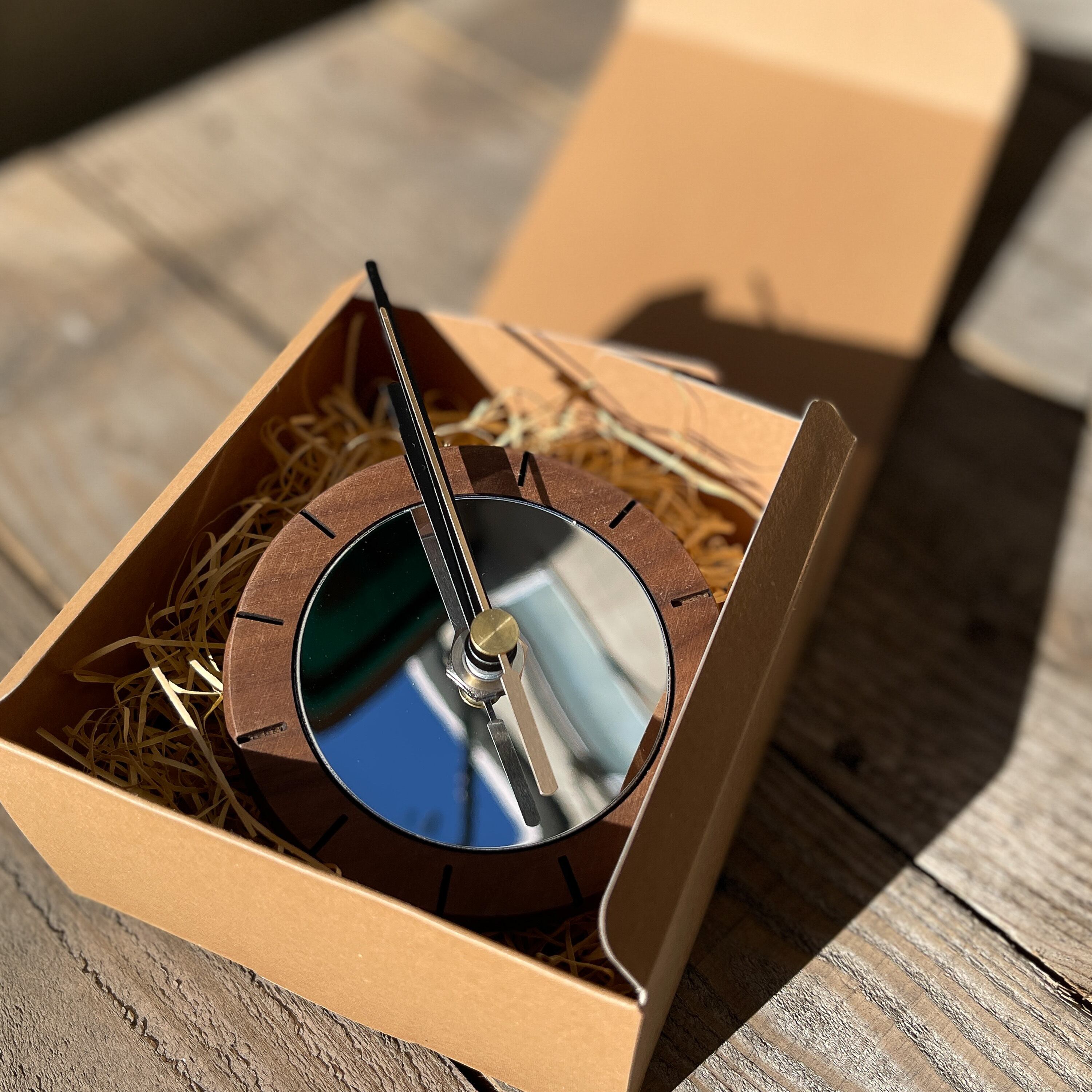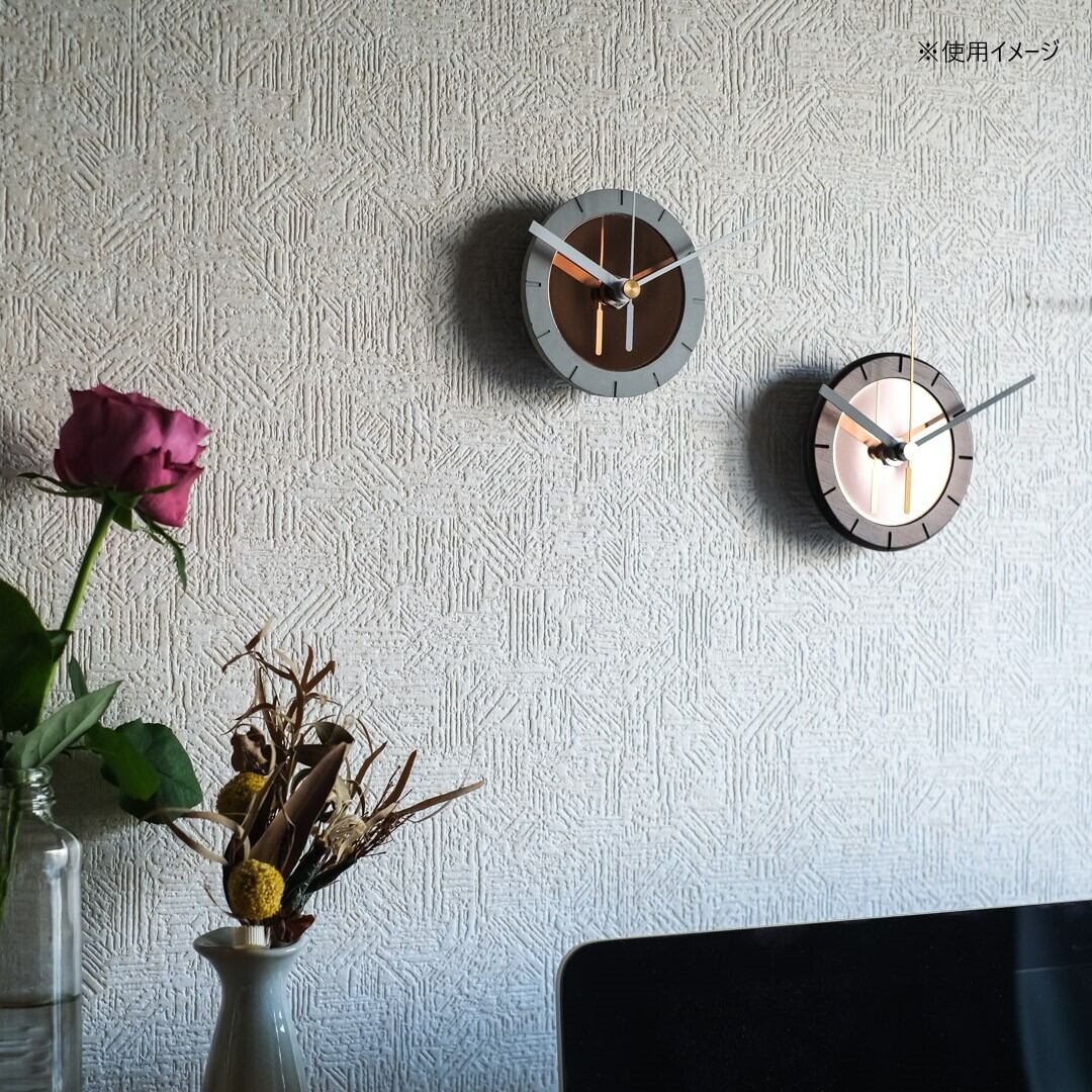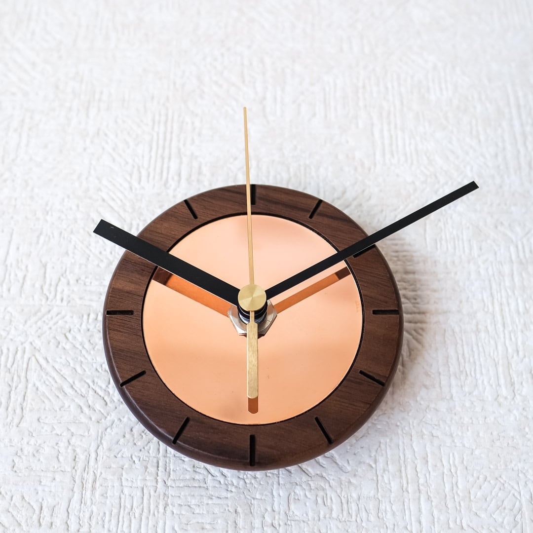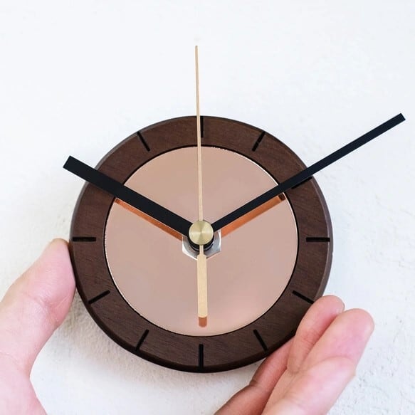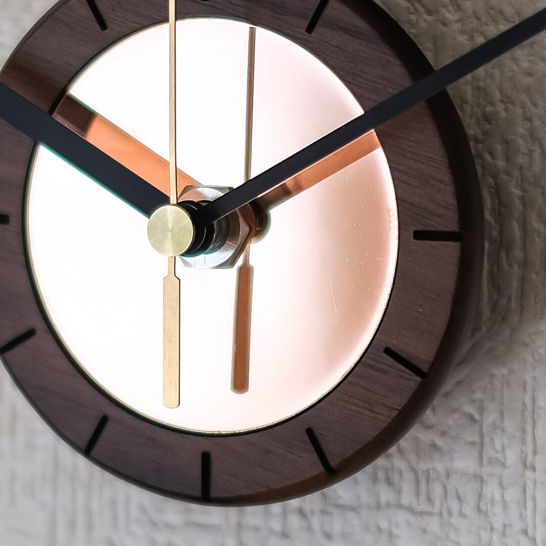 鏡面光沢の意匠板とシンプルなウッドフレームを組み合わせることで素材のコントラストが楽しめ、小さいながらも存在感のある時計です。