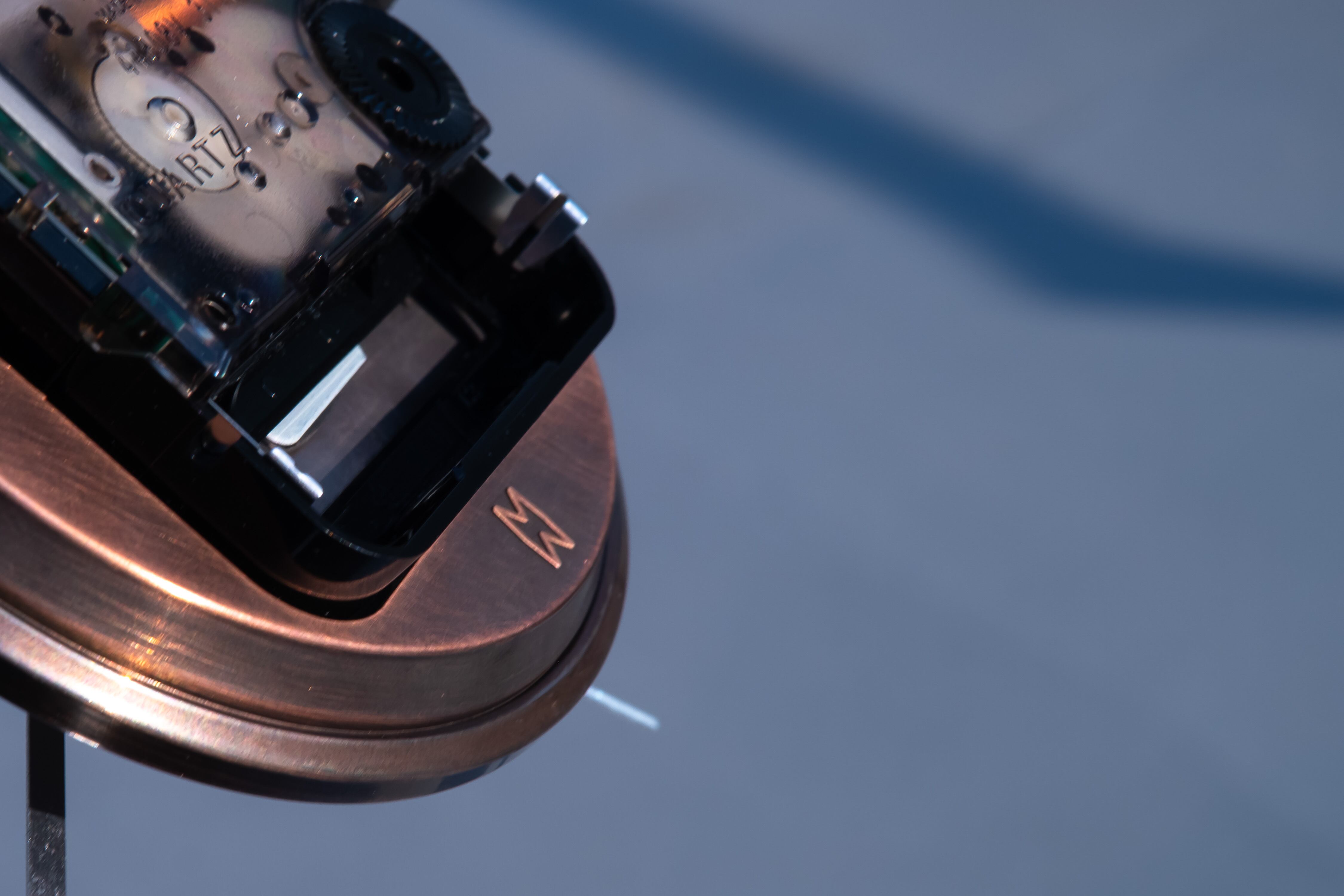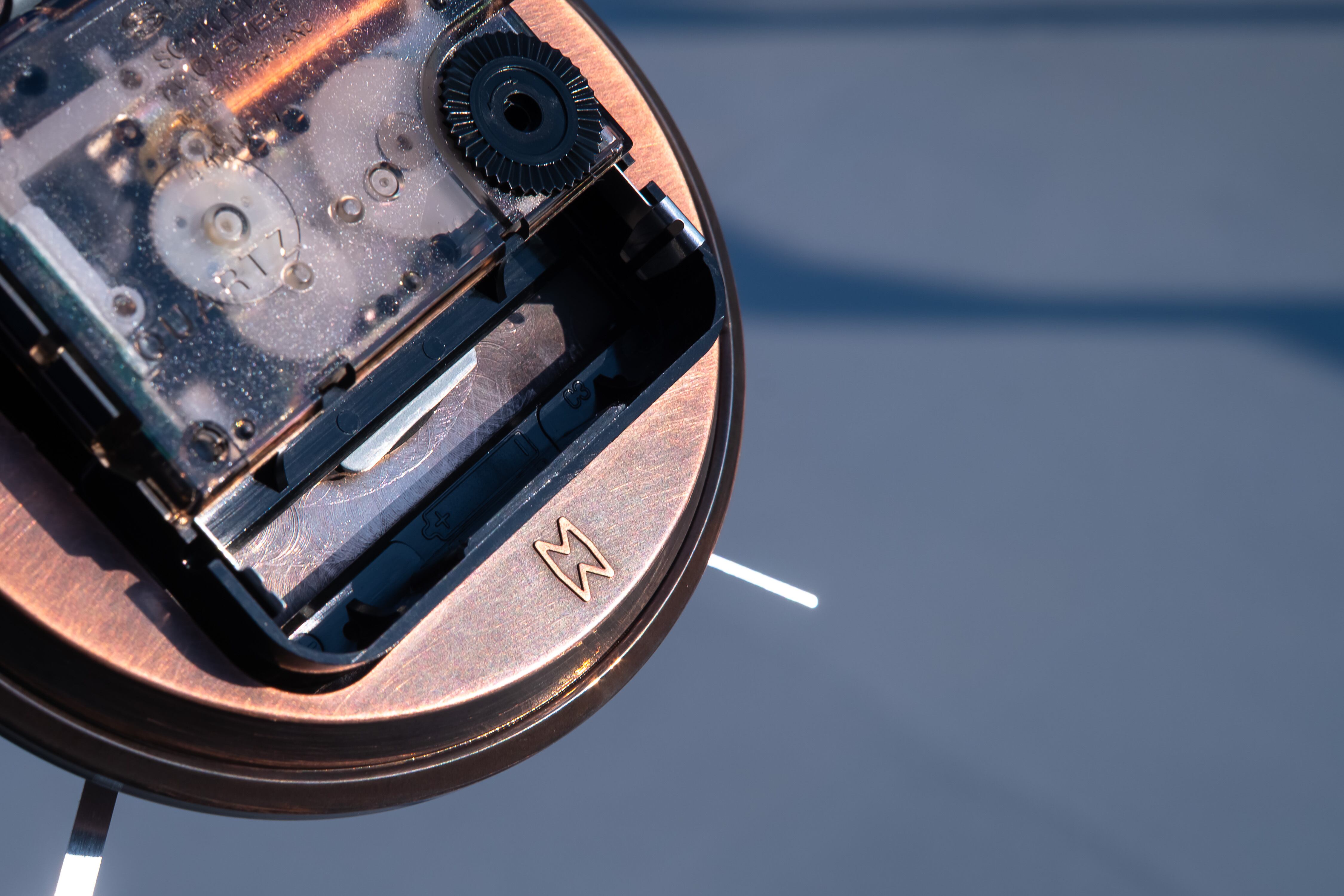 文字盤には銅めっきに化学反応で色付けし、手作業で磨きをかけた特別な仕上げを採用。伝統工芸に近いアプローチで、一点一点異なる色味と模様を持つ、まさに一点もののような表面仕上げです。
